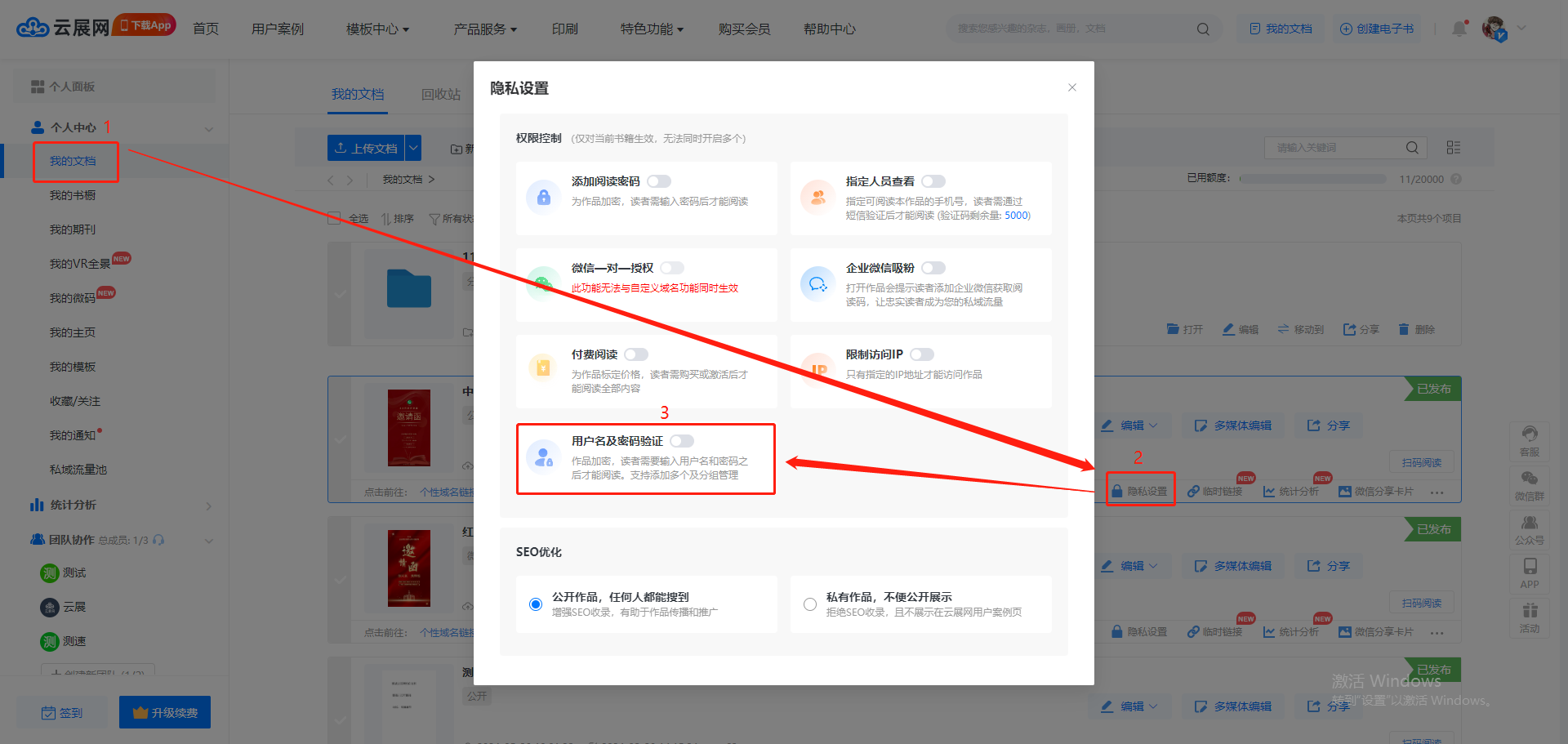 點(diǎn)擊【我的文檔】,選擇要設(shè)置的書(shū)本,點(diǎn)擊【隱私設(shè)置】,打開(kāi)【用戶(hù)名及密碼驗(yàn)證】。