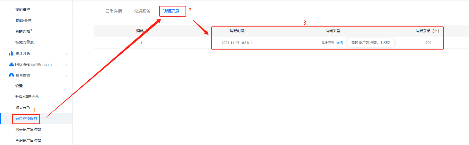 點(diǎn)擊【云幣兌換服務(wù)】,再點(diǎn)擊【明細(xì)記錄】,即可查看云幣兌換明細(xì)。