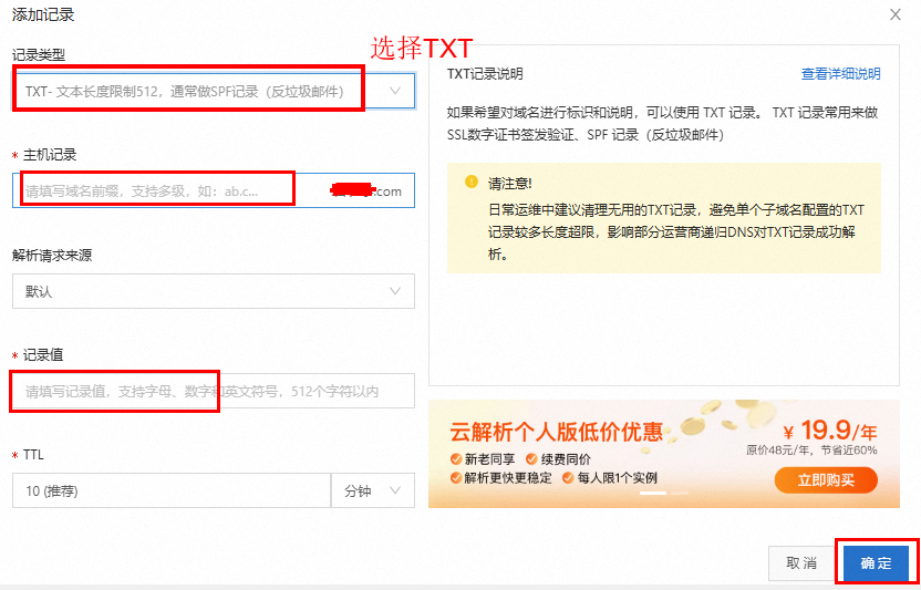 6)選擇TXT,并且填寫第二步復(fù)制的主機(jī)記錄以及記錄值,點擊【確定】
