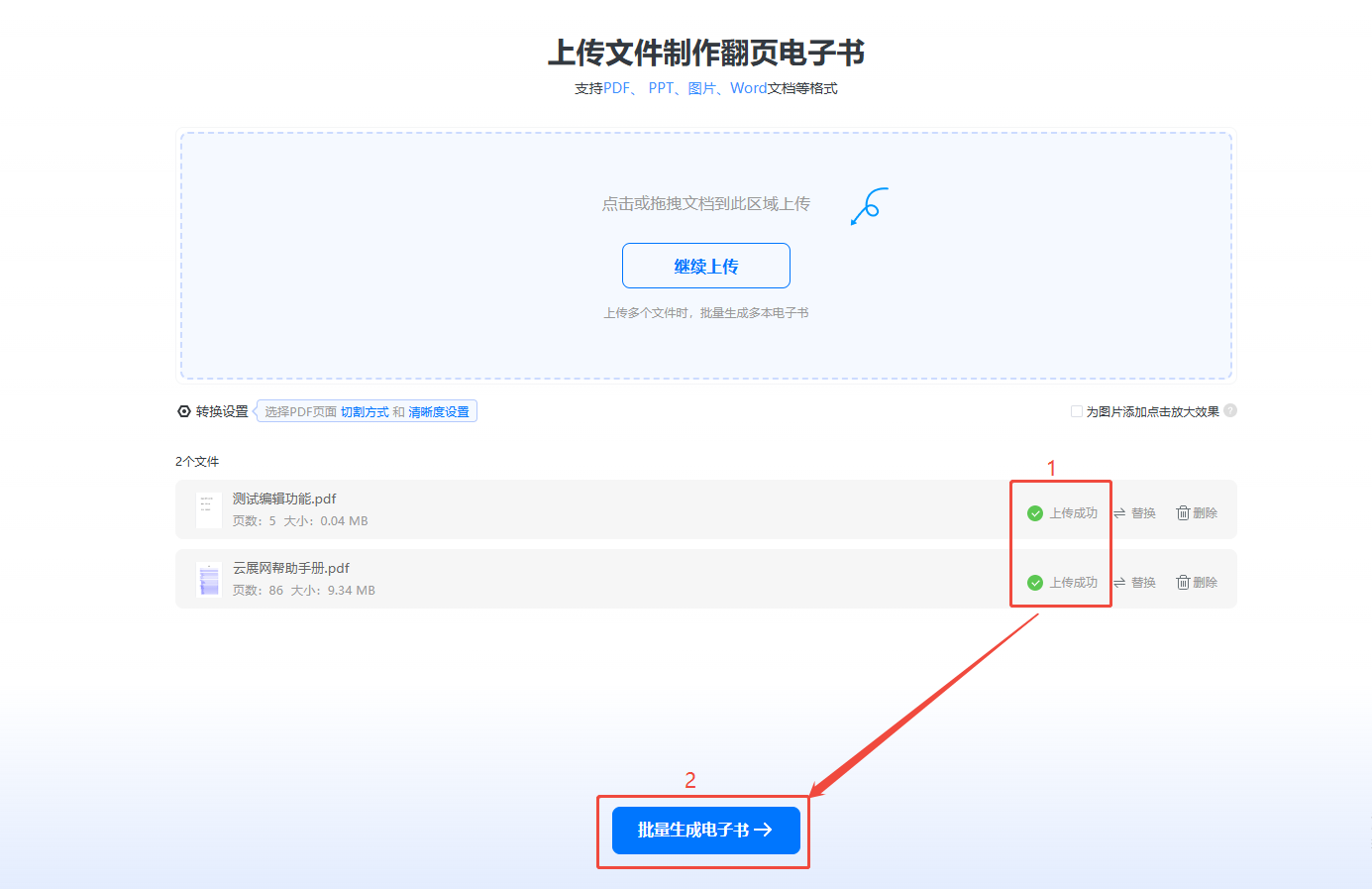 當(dāng)顯示【上傳成功】時,點擊下方【批量生成電子書】,電子書開始生成。