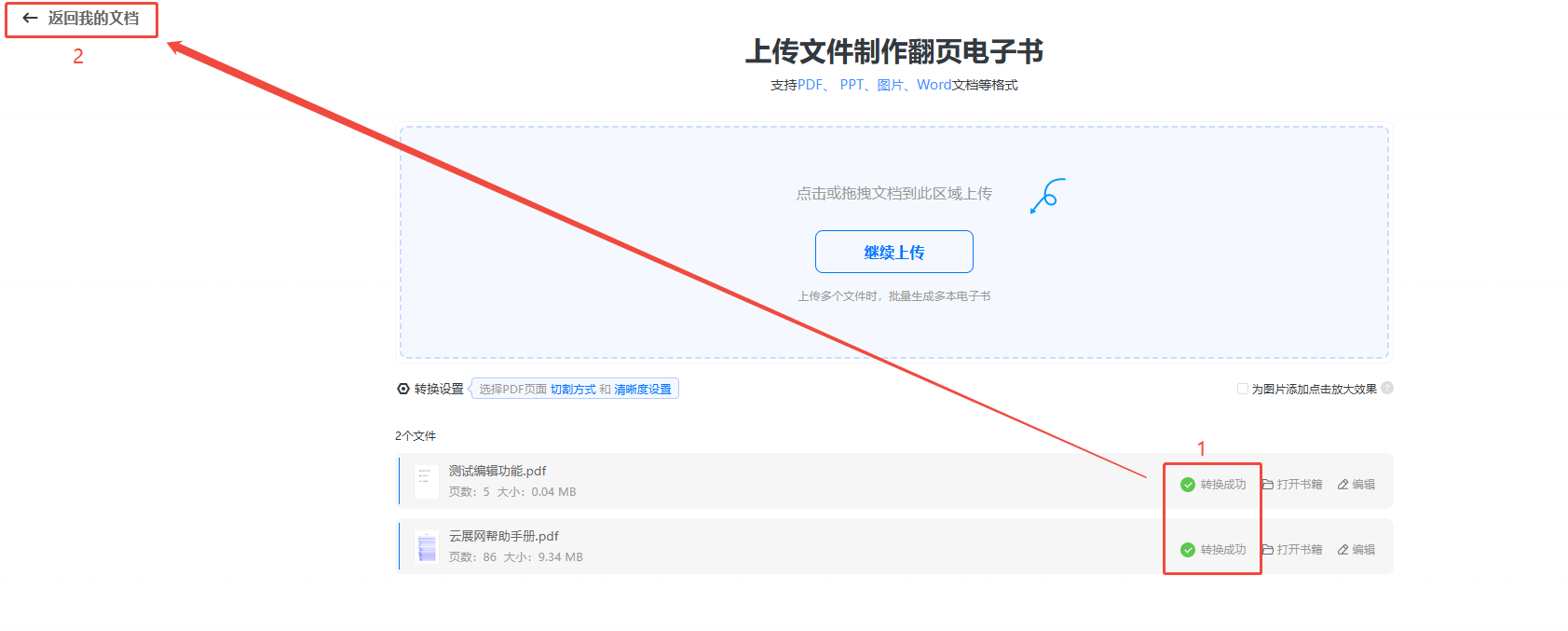 當(dāng)顯示【轉(zhuǎn)換成功】時,就意味著電子畫冊已經(jīng)生成了,可以點擊左上角【返回我的文檔】查看。
