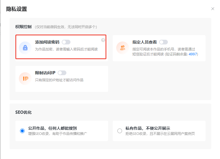 此功能可以給制作的微碼設(shè)置一個或多個密碼,這樣讀者需要輸入設(shè)置的密碼才可以閱讀該微碼,添加密碼可以有效保護(hù)微碼內(nèi)容的安全性和隱私。