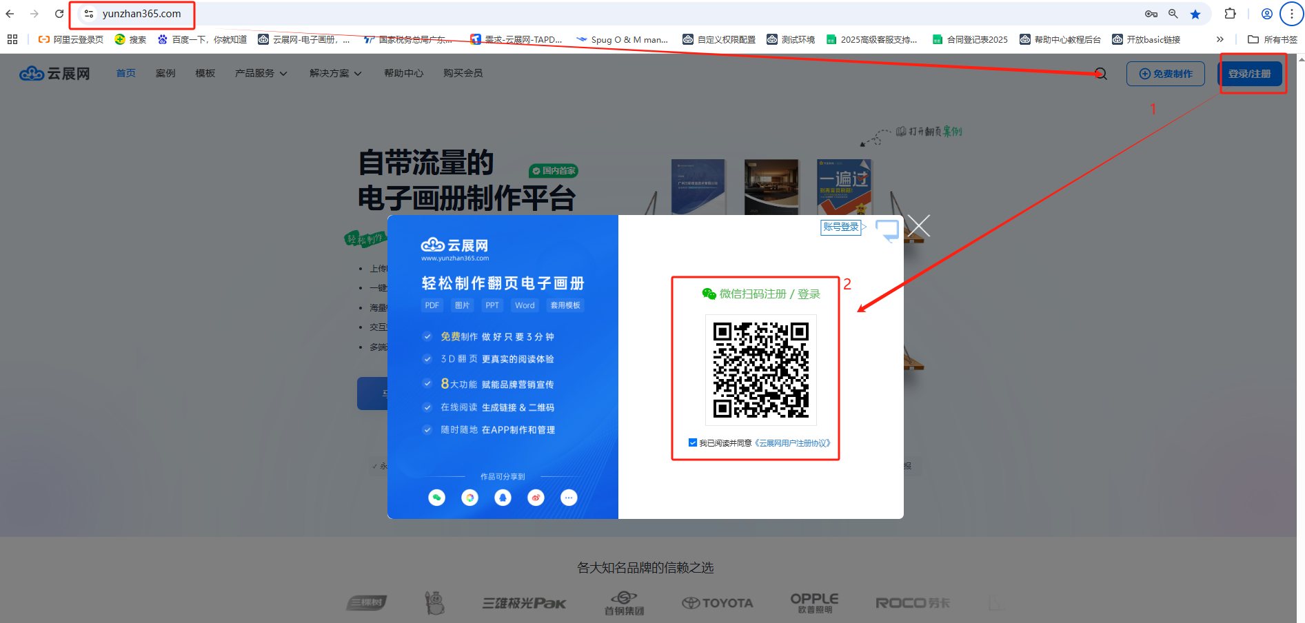 在電腦上打開瀏覽器,輸入網(wǎng)址http://m.mtln.com.cn/打開云展網(wǎng),然后點擊右上角的【登錄/注冊】按鈕,用微信掃描二維碼登錄