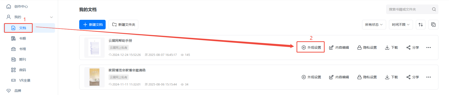 點擊【文檔】,找到對應(yīng)電子書,點擊【外觀設(shè)置】。