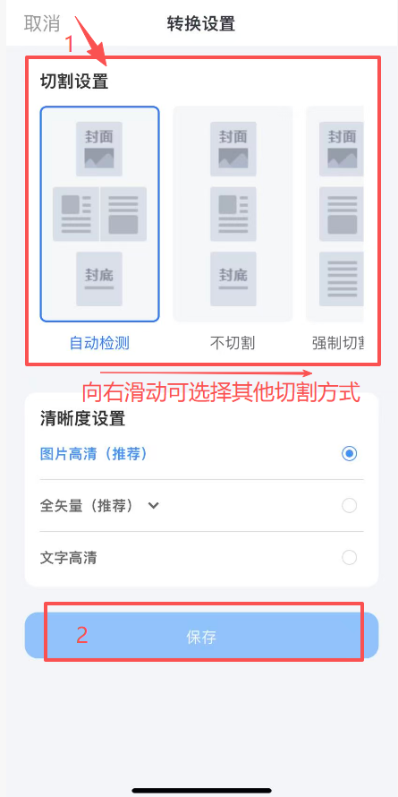 點擊【轉(zhuǎn)換設置】打開,選擇切割方式后,點擊【保存】,隨后繼續(xù)上傳文檔進行制作