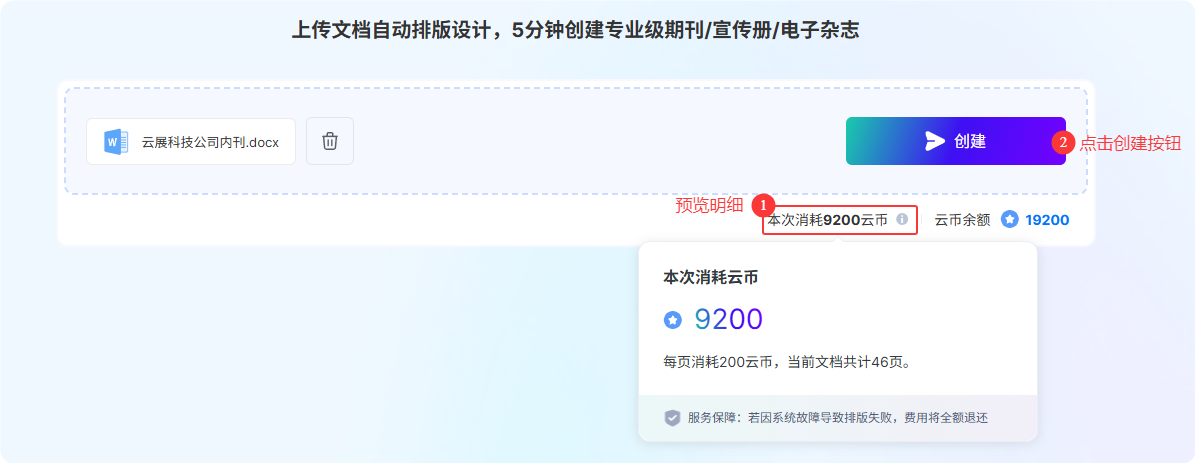 文檔上傳成功后, 可以在【創(chuàng)建】按鈕下方查看此次制作所需消耗的云幣明細(xì)。