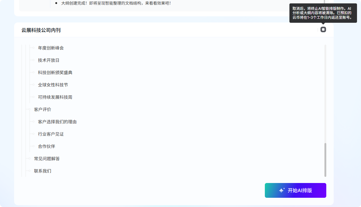 ① 開(kāi)始AI排版之前,若需重新上傳文檔,可點(diǎn)擊右上角【取消】按鈕終止當(dāng)前流程,預(yù)扣云幣將在 1-3 個(gè)工作日內(nèi)自動(dòng)返還至賬戶。