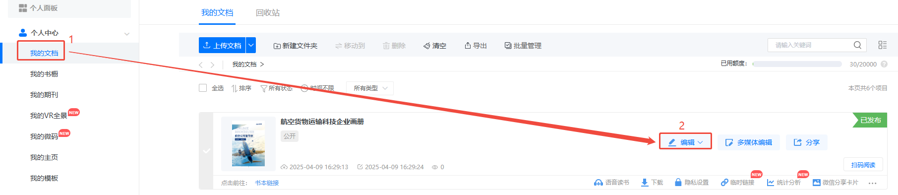 點(diǎn)擊【我的文檔】,選擇需要設(shè)置的電子畫冊(cè),點(diǎn)擊【編輯】。
