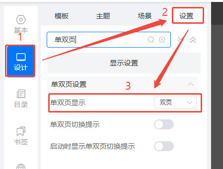 點(diǎn)擊【設(shè)計(jì)】,然后點(diǎn)擊【設(shè)置】,把【單雙頁(yè)顯示】改為雙頁(yè)即可。
