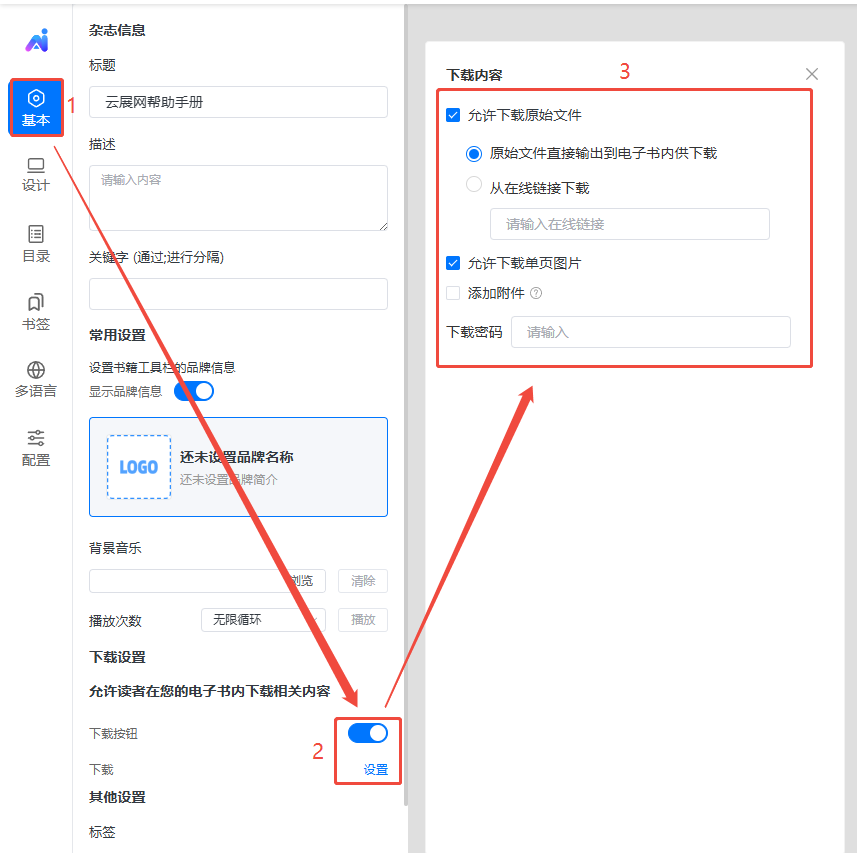 點擊【基本】,下方打開下載按鈕,電子書的工具欄上就會出現(xiàn)下載按鈕,然后點擊【設(shè)置】,設(shè)置下載內(nèi)容。