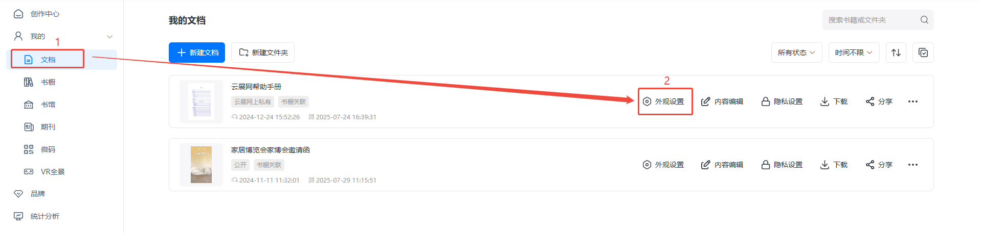 點擊【文檔】,選擇需要設(shè)置的電子書,點擊【外觀設(shè)置】。