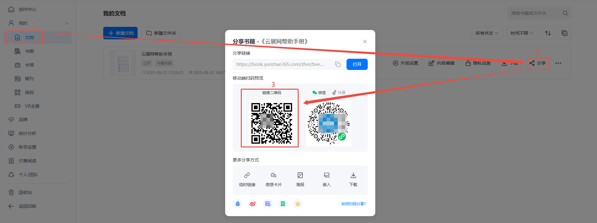 在【文檔】頁面,點擊【分享】,找到鏈接二維碼。