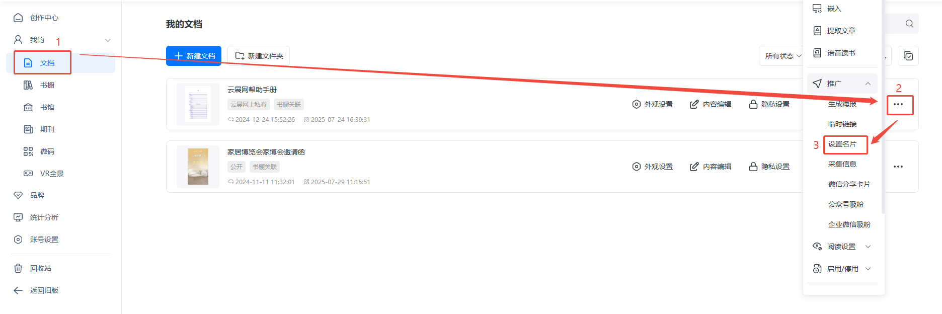 點(diǎn)擊【文檔】,選擇需要的電子書(shū),點(diǎn)擊右邊三個(gè)點(diǎn),選擇【推廣】,點(diǎn)擊【設(shè)置名片】,打開(kāi)名片設(shè)置界面。