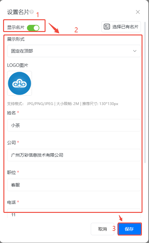 打開(kāi)【顯示名片】,選擇一個(gè)【展示形式】,下方上傳logo輸入對(duì)應(yīng)信息后,點(diǎn)擊保存即可。