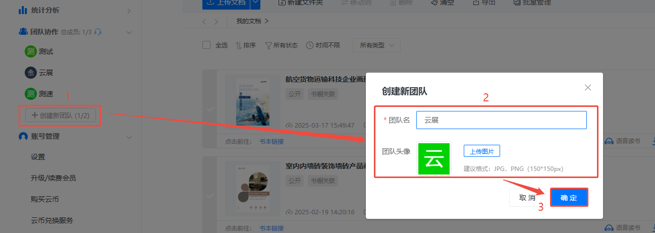 點(diǎn)擊【創(chuàng)建新團(tuán)隊(duì)】,輸入團(tuán)隊(duì)名以及上傳團(tuán)隊(duì)頭像后點(diǎn)擊【確定】,即為創(chuàng)建成功。