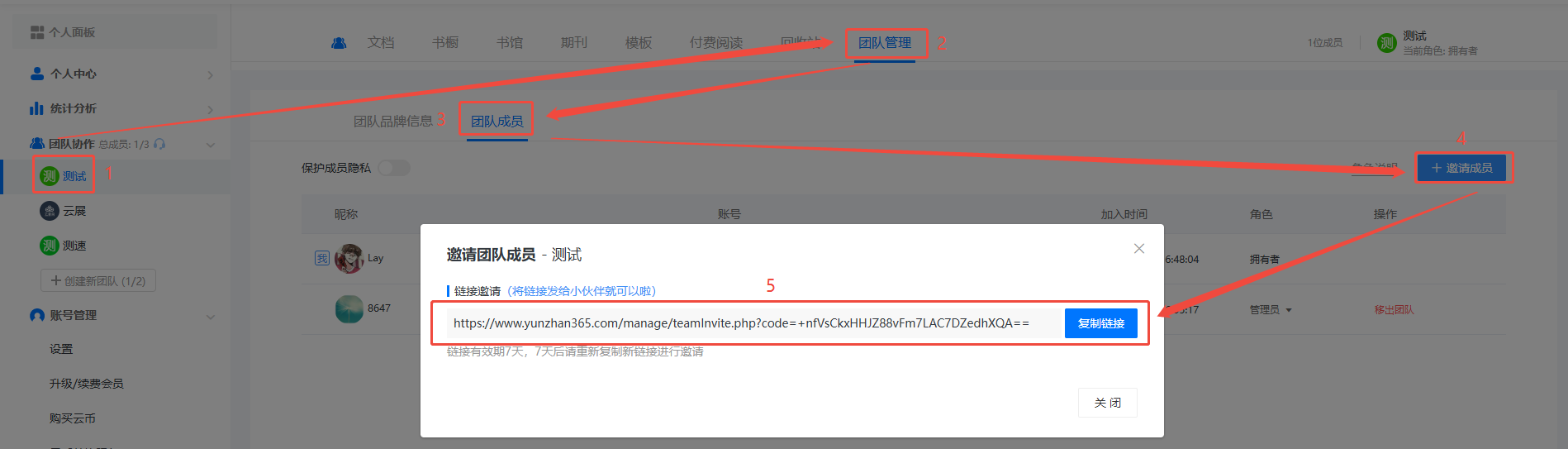 點(diǎn)進(jìn)創(chuàng)建的團(tuán)隊(duì),點(diǎn)擊【團(tuán)隊(duì)管理】,然后點(diǎn)擊【團(tuán)隊(duì)成員】,再點(diǎn)擊【邀請成員】,會(huì)有一個(gè)邀請鏈接,復(fù)制后發(fā)給好友,好友點(diǎn)擊鏈接進(jìn)去即可申請加入團(tuán)隊(duì)。