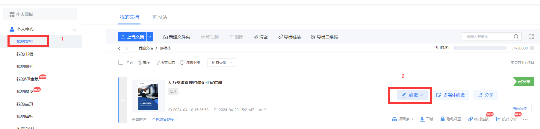 在【我的文檔】中找到需要添加目錄的雜志,點擊“編輯”按鈕
