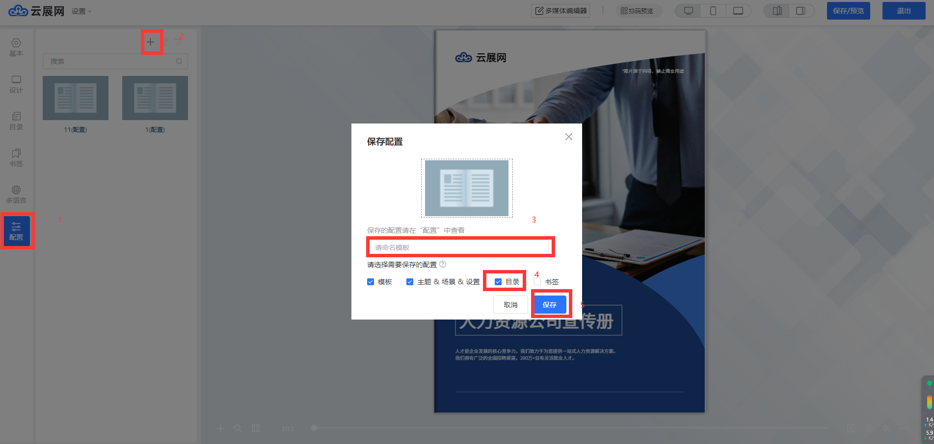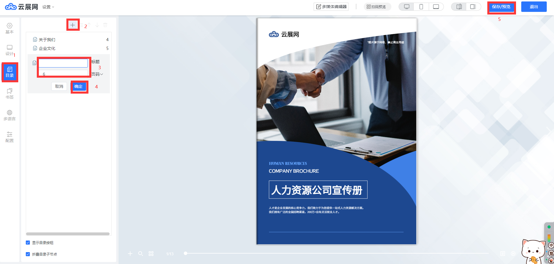 選擇【目錄】,點擊【+】按鈕,即可設(shè)置標(biāo)題,頁碼。添加好所有目錄后點擊保存預(yù)覽。