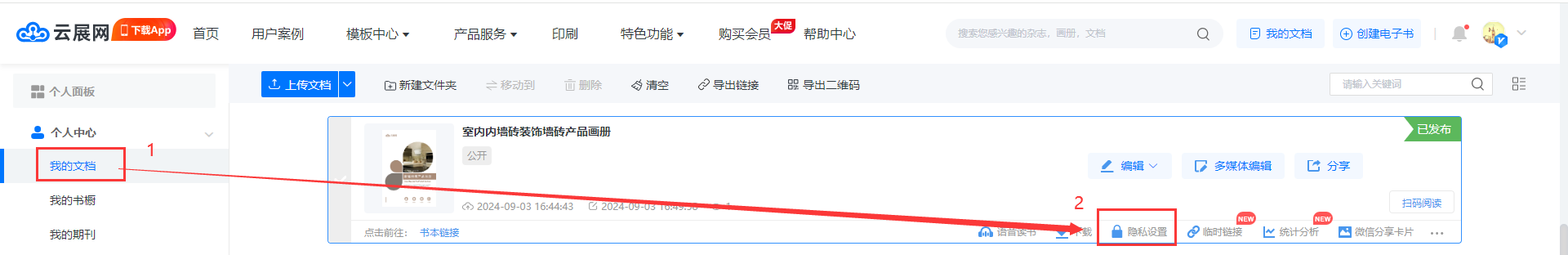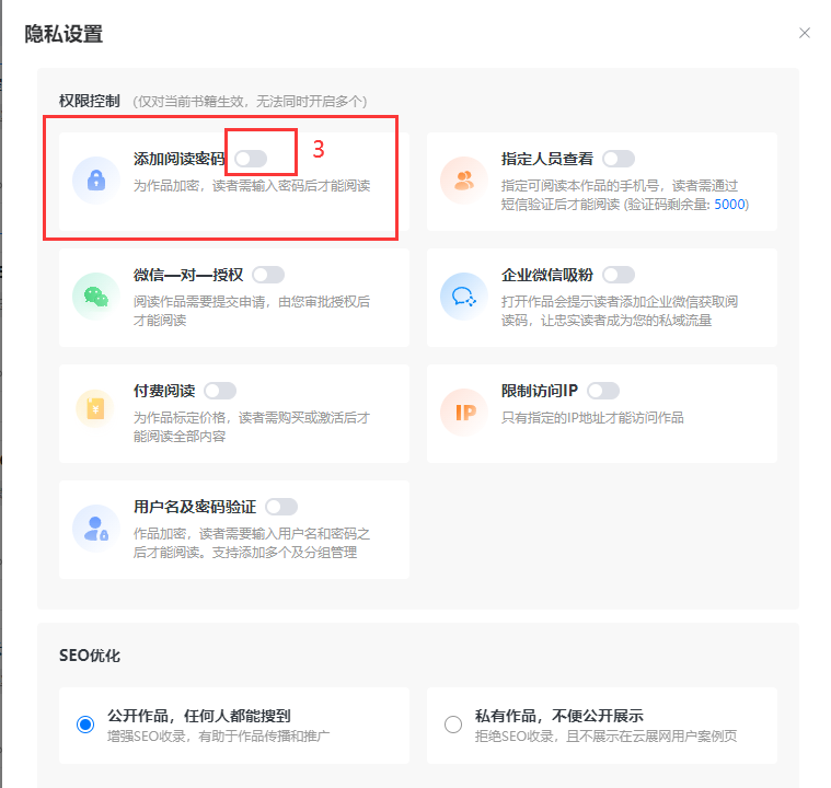 找到你需要添加閱讀密碼的電子書(shū),點(diǎn)擊【隱私設(shè)置】,勾選【添加閱讀密碼】。