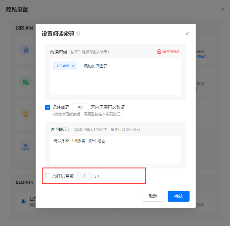 如果你想允許讀者看幾頁(yè)之后再要求輸入密碼,可設(shè)置一下允許查看幾頁(yè)。