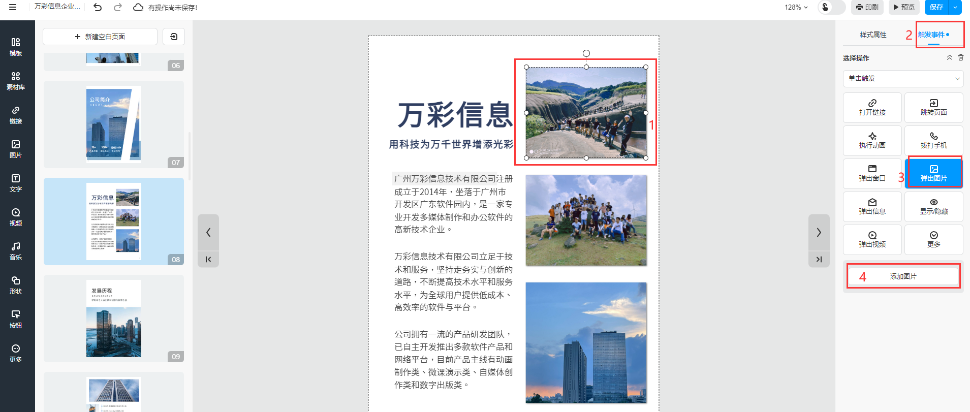 ①、選中需要彈出圖片的位置,可以是文字或者圖片,然后點擊【觸發(fā)事件】選擇【彈出圖片】