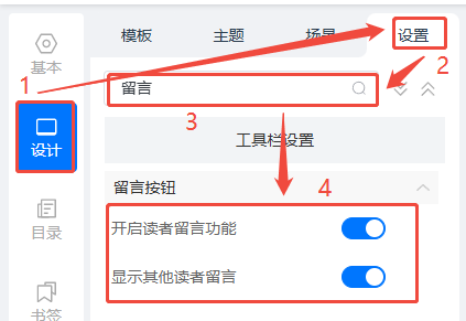 點擊【設(shè)計】,然后點擊【設(shè)置】,搜索欄搜索【留言】,將【開啟讀者留言功能】和【顯示其他讀者留言】打開。