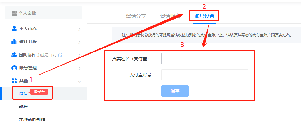 點(diǎn)擊【邀請(qǐng)】,然后點(diǎn)擊【賬號(hào)設(shè)置】,下方填寫支付寶真實(shí)姓名和支付寶賬號(hào),并保存。