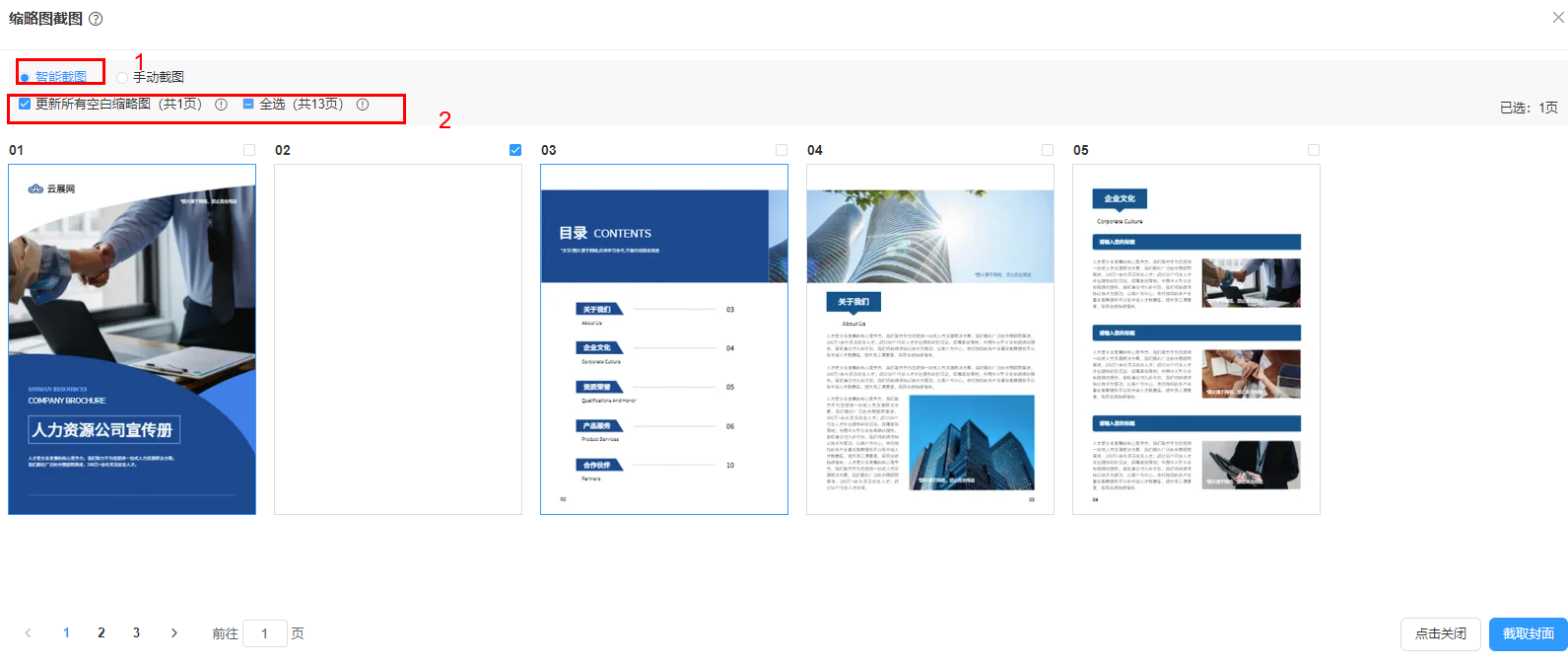 選擇【智能截圖】,勾選你需要截圖的頁面,點擊【截取封面】后,等待生成并截圖完成。