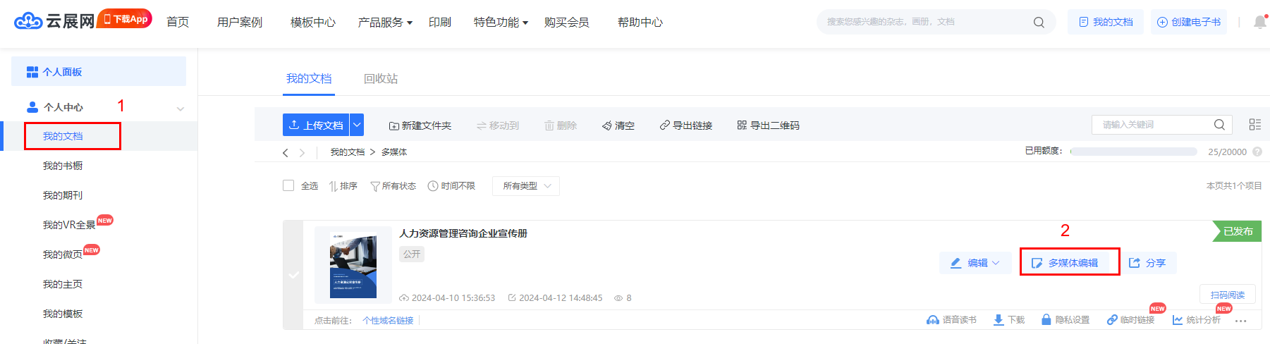 點進【我的文檔】/【文檔】,選擇對應(yīng)電子書,點擊【多媒體編輯】/【內(nèi)容編輯】