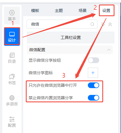 點擊【設(shè)計】,然后點擊【設(shè)置】,將【只允許在微信瀏覽器中打開】和【禁止微信內(nèi)置瀏覽器分享】打都打開。