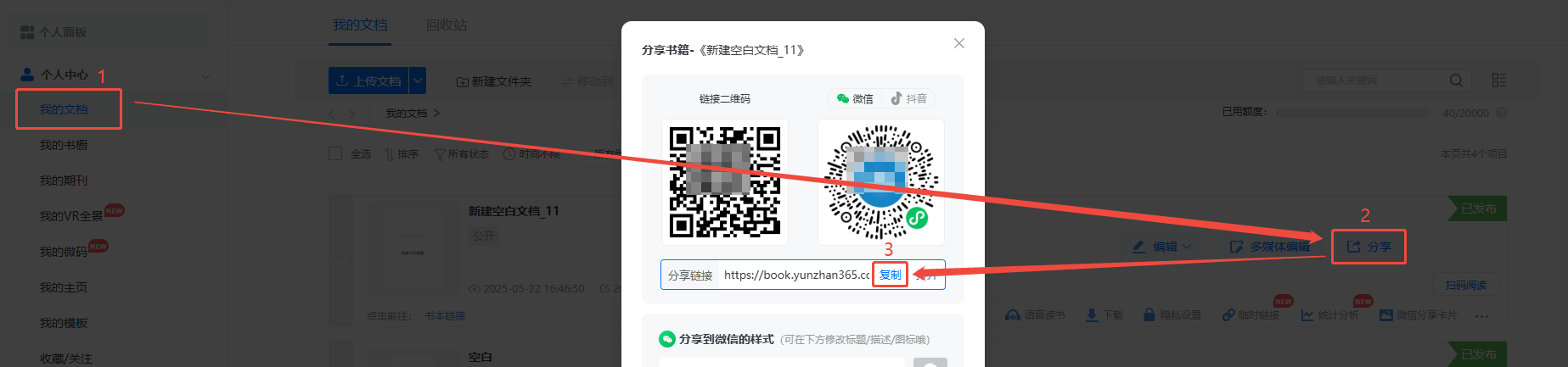 點擊【我的文檔】,然后點擊【分享】,復(fù)制書本鏈接