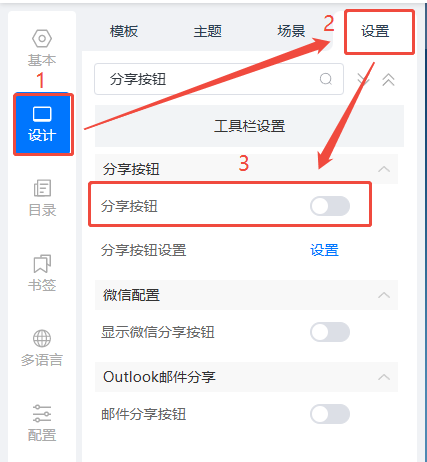 點擊【設(shè)計】,然后點擊【設(shè)置】,將【分享按鈕】關(guān)閉。