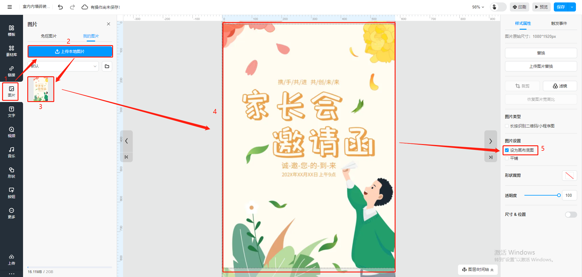 選擇【圖片】,點擊【上傳本地圖片】上傳圖片,點擊上傳好的圖片添加到頁面中,勾選【設(shè)為畫布底圖】。