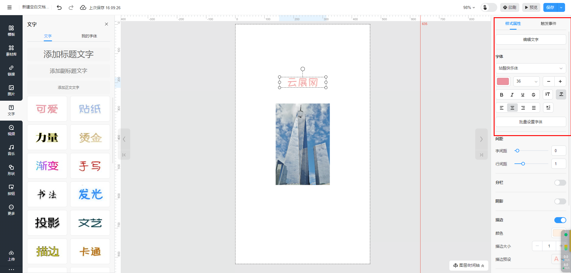 選擇【文字】進(jìn)入文字界面,單擊/拖拽文字類型添至電子書頁(yè)面,并雙擊文字框輸入文本內(nèi)容。也可以選擇云展提供的藝術(shù)字進(jìn)行設(shè)計(jì)。