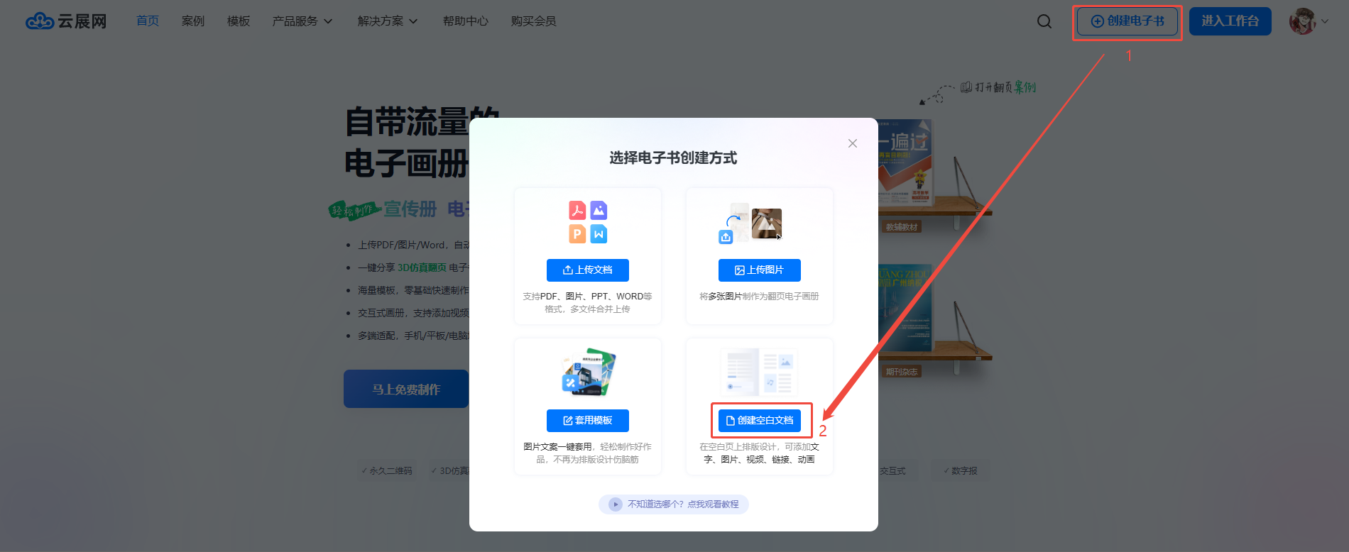 進(jìn)入云展網(wǎng)首頁(yè),登錄你的賬號(hào),點(diǎn)擊【免費(fèi)制作】,進(jìn)入電子書創(chuàng)建方式操作界面后,點(diǎn)擊【創(chuàng)建空白文檔】。