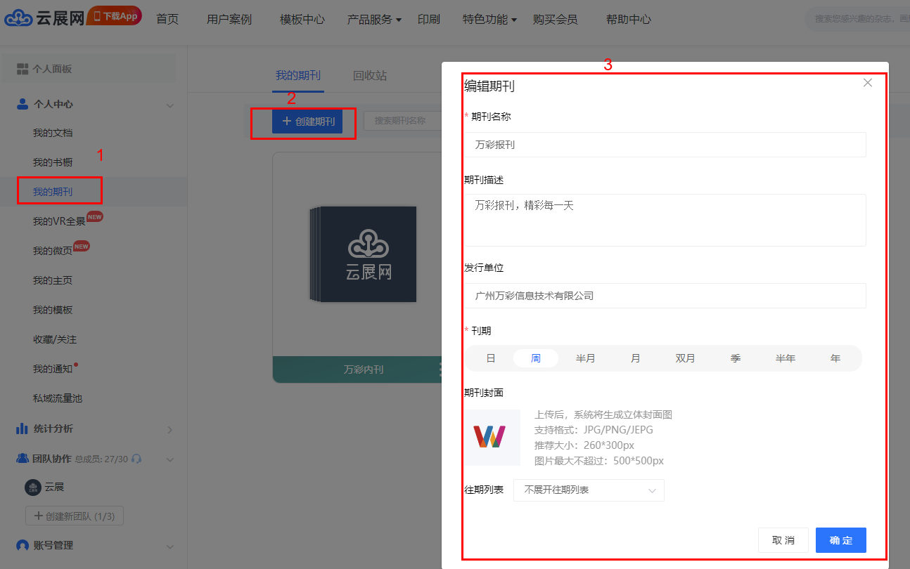 點擊【我的期刊】,【創(chuàng)建期刊】,輸入期刊名稱,描述,單位,刊期(如日刊選日),封面,也可以設(shè)置是否展開期刊列表