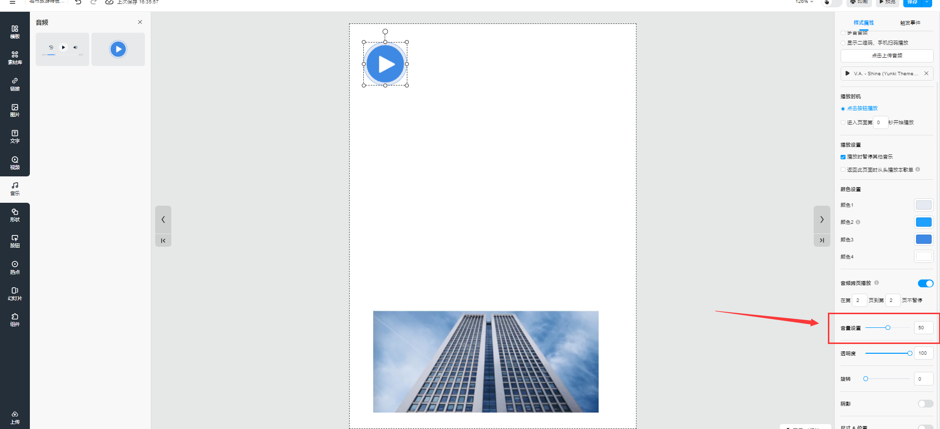 點(diǎn)擊【音樂】選擇音樂控件添加到頁面上,然后點(diǎn)擊【樣式屬性】,點(diǎn)擊【上傳音頻】,上傳mp3格式的音樂文件