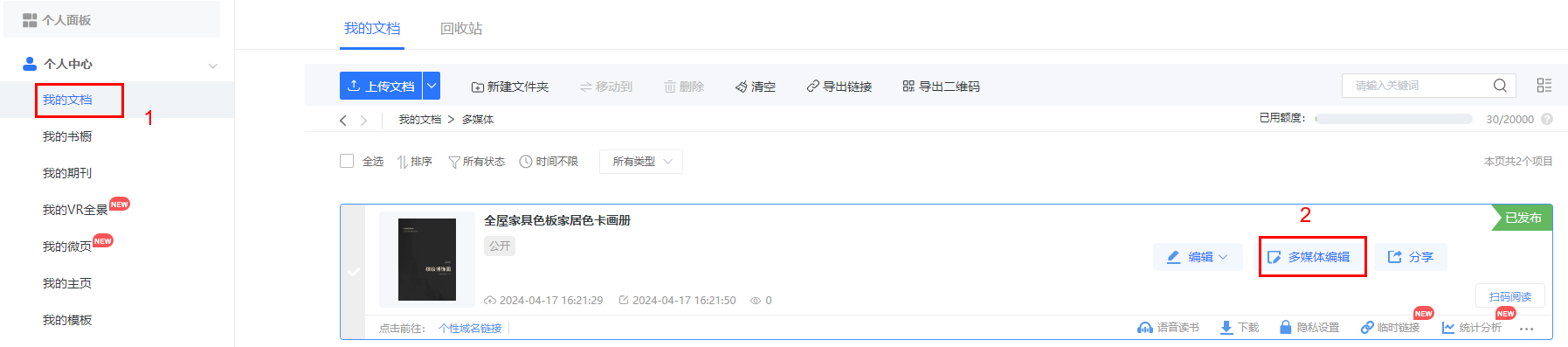 (1)在【我的文檔】/【文檔】中找到需要應(yīng)用模板的書,點擊【多媒體編輯】/【內(nèi)容編輯】