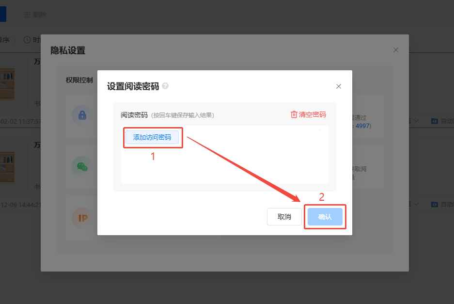 勾選【添加閱讀密碼】彈出彈窗,點(diǎn)擊【添加訪問密碼】輸入密碼后點(diǎn)擊【確定】即可。