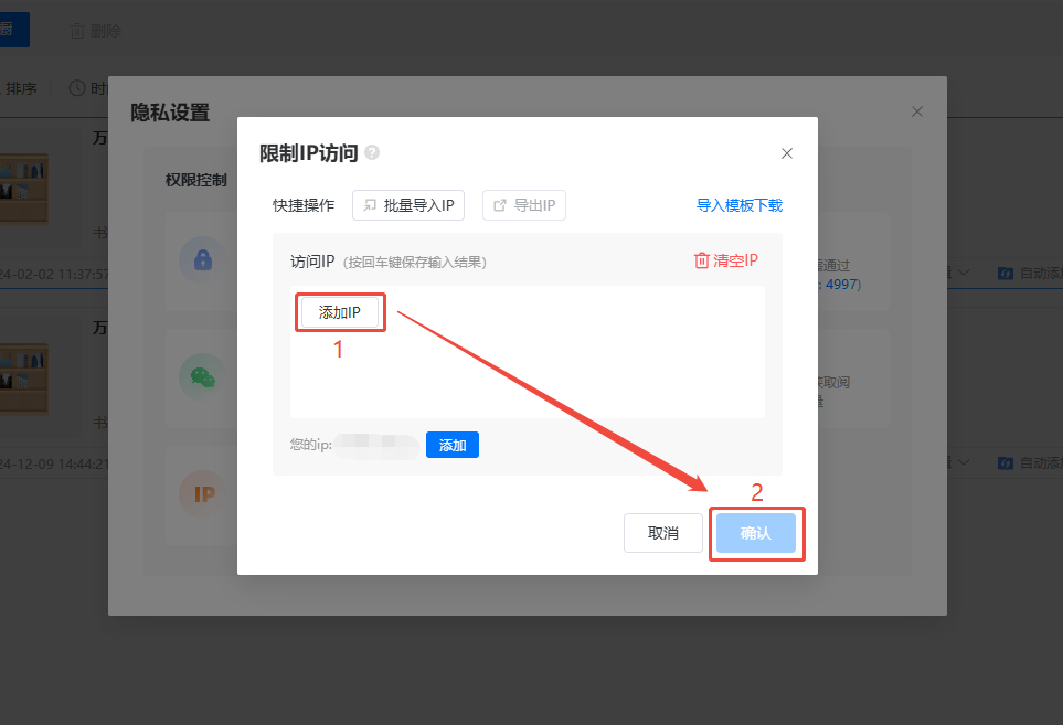勾選【限制訪問IP】彈出彈窗,點(diǎn)擊【添加IP】輸入IP地址后點(diǎn)擊【確認(rèn)】即可。