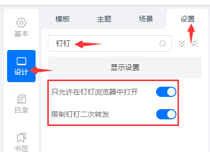 2.點(diǎn)擊“設(shè)計(jì)”,點(diǎn)擊“設(shè)置”,搜索框搜索“釘釘”,打開以下兩個(gè)配置