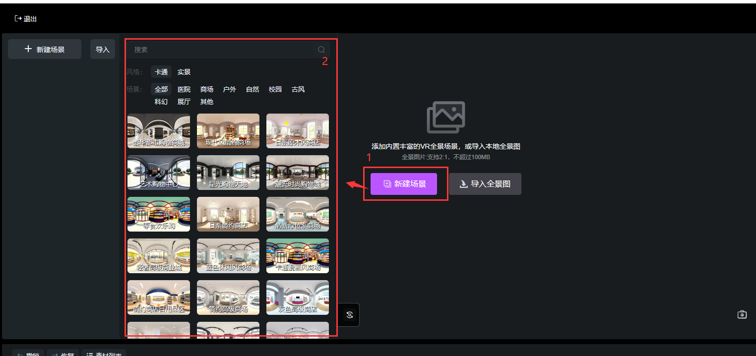 點(diǎn)擊【新建場(chǎng)景】添加內(nèi)置豐富的VR全景場(chǎng)景