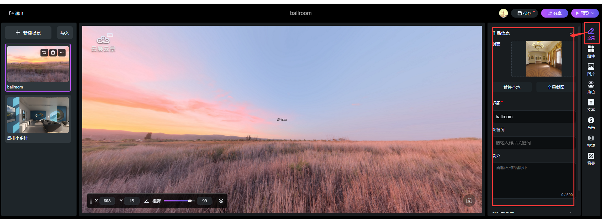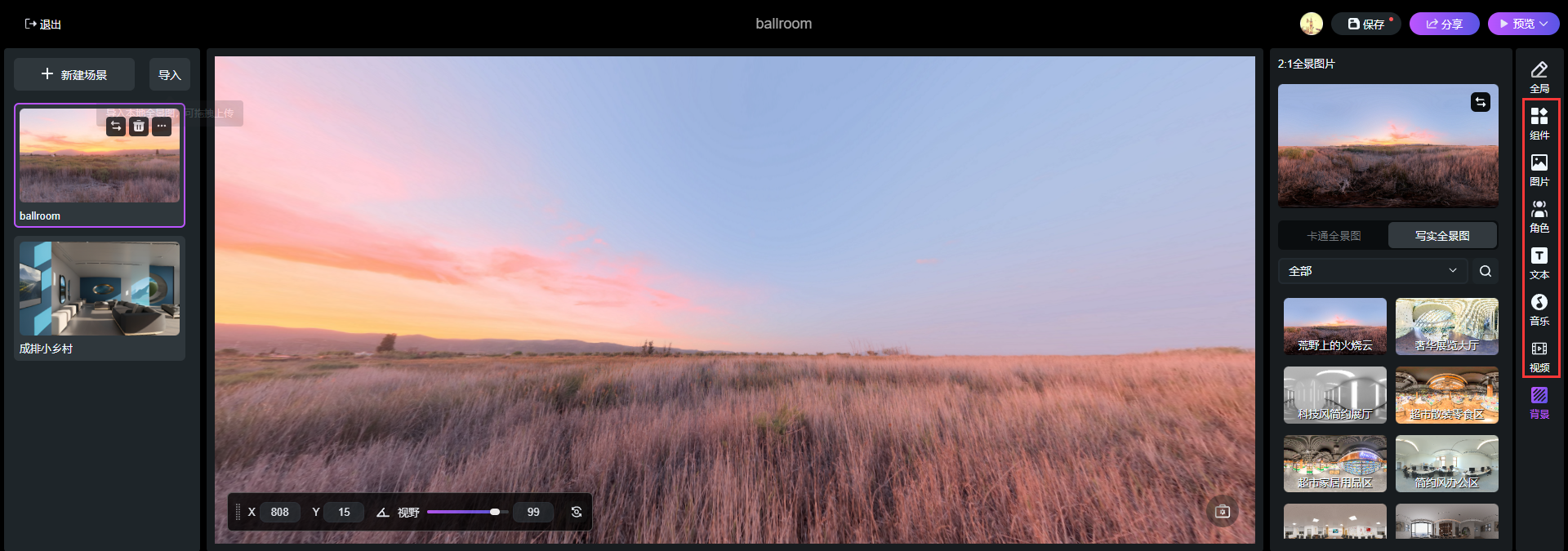 1)添加內(nèi)置豐富的VR全景場(chǎng)景