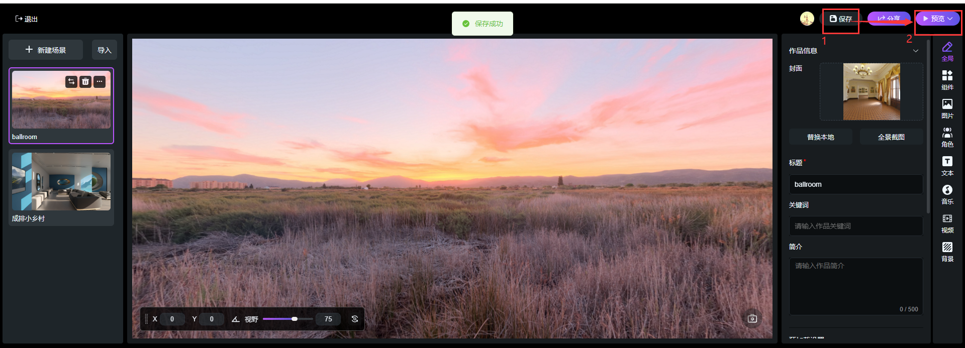 在頁(yè)面右側(cè)可設(shè)置組件、圖片、角色、文本、音樂、視頻等多種交互元素,滿足客戶的不同使用需求,同時(shí)可引導(dǎo)觀眾探索,增強(qiáng)故事敘述,使得虛擬體驗(yàn)更加生動(dòng)和有趣。