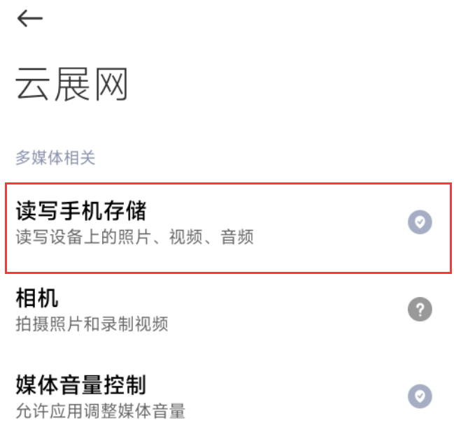 可能是app向您申請存儲訪問權(quán)限時,您拒絕過,重新打開權(quán)限即可,請看如下操作: