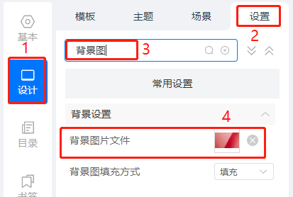 點(diǎn)擊【設(shè)計(jì)】,再點(diǎn)擊【設(shè)置】,點(diǎn)擊【背景圖片文件】上傳圖片