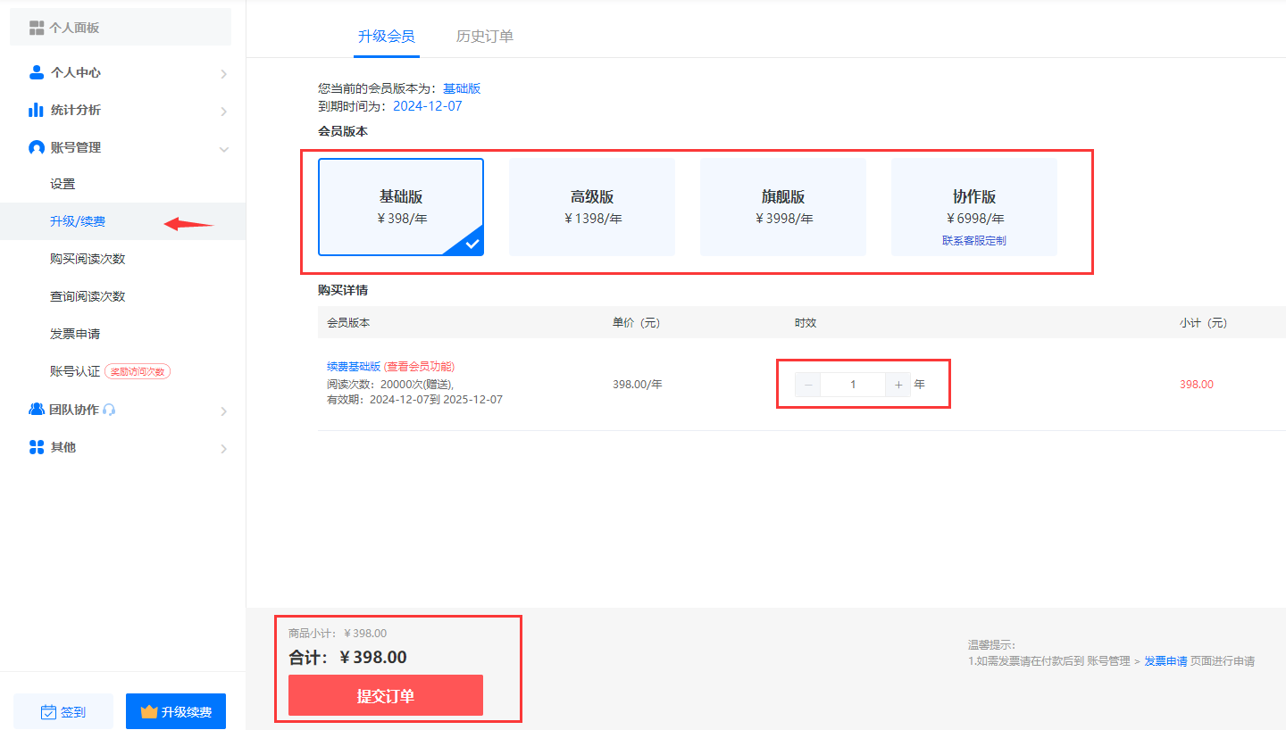 登錄需要續(xù)費的賬號,然后選擇購買的版本,提交訂單以后選擇支付方式付款。如圖: