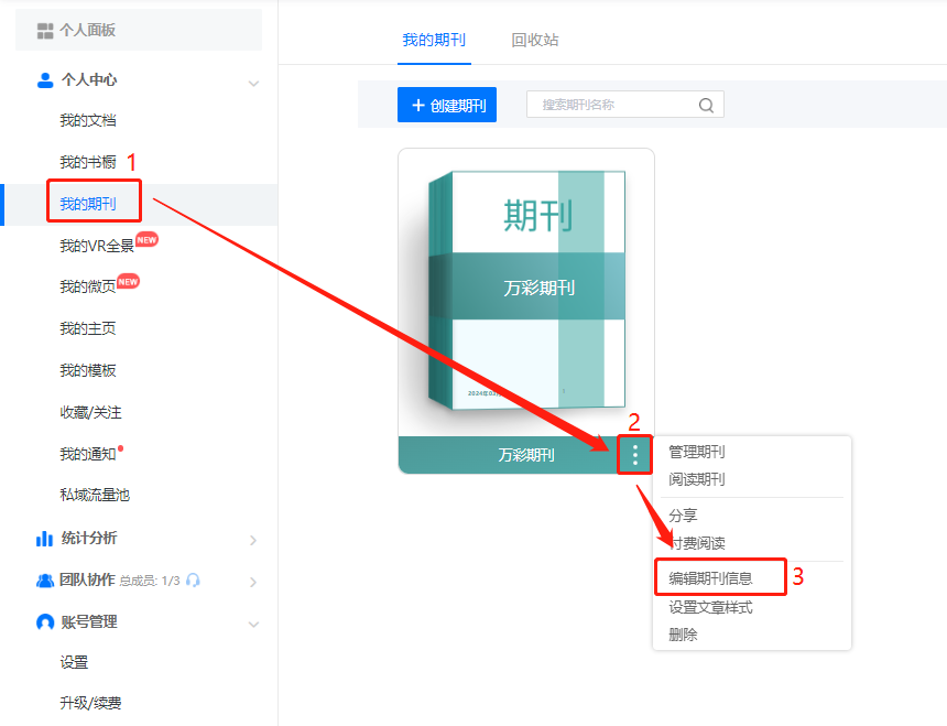 在【我的期刊】中,選擇要操作的期刊,點擊三個點,打開【編輯期刊信息】