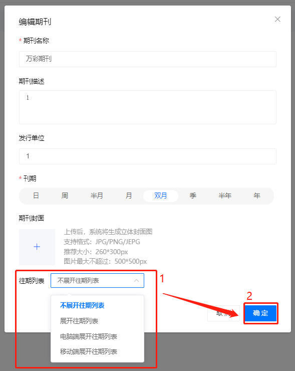 【往期列表】選擇一個展開方式,如果需要電腦端和移動端都展開往期列表,選擇【展開往期列表】即可,最后點擊【確定】即可保存