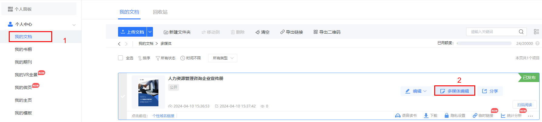 點進(jìn)【我的文檔】/【文檔】,選擇對應(yīng)電子書,點擊【多媒體編輯】/【內(nèi)容編輯】。